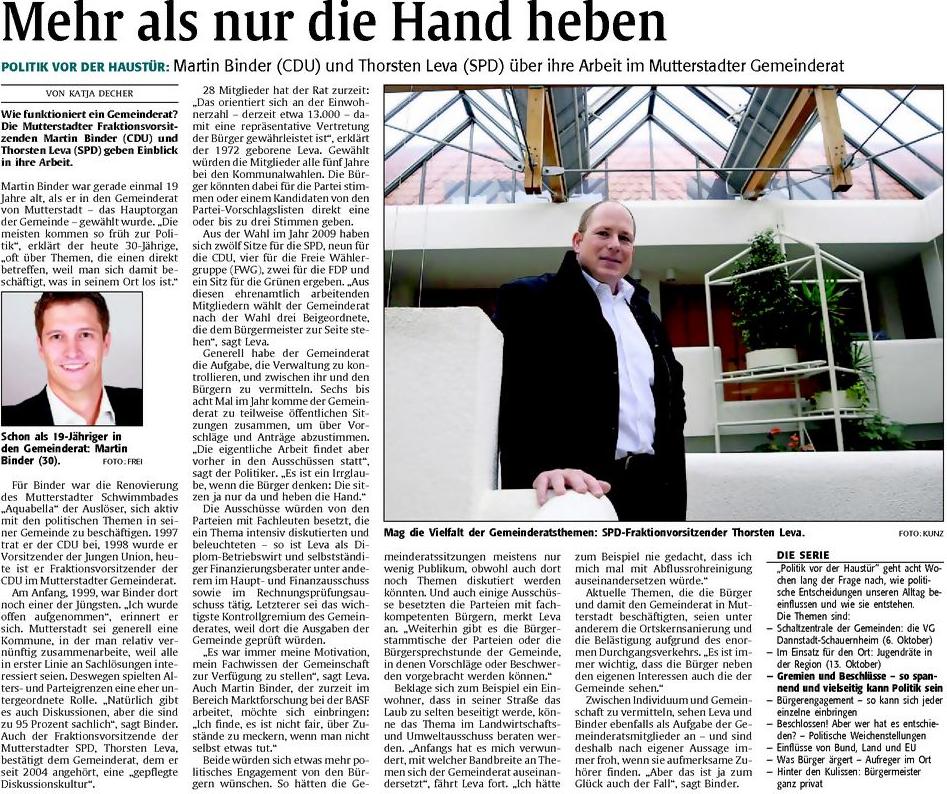 Am Anfang, 1999, war Binder dort noch einer der Jüngsten. „Ich wurde offen aufgenommen", erinnert er sich. Mutterstadt sei generell eine Kommune, in der man relativ vernünftig zusammenarbeite, weil alle in erster Linie an Sachlösungen interessiert seien. Deswegen spielten Alters- und Parteigrenzen eine eher untergeordnete Rolle. „Natürlich gibt es auch Diskussionen, aber die sind zu 95 Prozent sachlich", sagt Binder. Auch der Fraktionsvorsitzende der Mutterstadter SPD, Thorsten Leva, bestätigt dem Gemeinderat, dem er seit 2004 angehört, eine „gepflegte Diskussionskultur".
